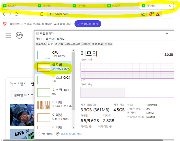 동일한 환경에서 테스트하기 위해 다른 창을 모두 닫고 네이버창만 5개 띄어두었을 때 브레이브 브라우저에서 메모리 사용률이 34%로 나와서 큰 차이가 없음