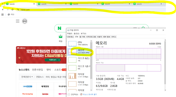 네이버창을 5개 띄어두었을 때 메모리 사용률이 35%로 나옴