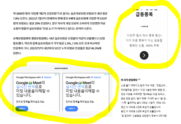 크롬이나 엣지등의 브라우저에서 인터넷 검색했을 때 광고가 나오는 화면(예시2)