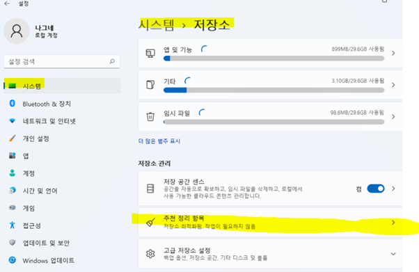 1. 설정 > 시스템 > 저장소 > 추천 정리 항목을 클릭합니다.
