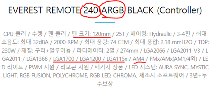 모델명에 Everest remote 240 에서 120mm 팬 2개가 있어서 120*2=240 해서 모델명에 240 적혀있는 것으로 추측할 수 있습니다.