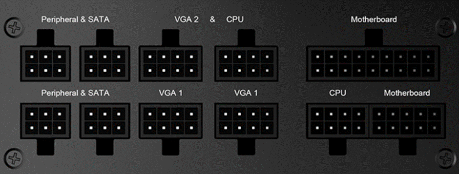 PCIe(6+2)8핀 6개: 이것이 바로 vga(그래픽)카드로 가는 케이블이 6개 있다는 것은 아닌거 같고 그림에서 처럼 vga1,vga1,vga2 에서 6핀+2핀이 3묶음 있다는 것 같습니다. 그럼 그래픽카드에 8핀짜리 3개를 연결하는 정도라면 엄청나게 고사양 그래픽이라고 보셔도 됩니다.
