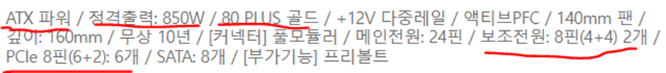 정격출력 850w 80plus 골드: 요즘은 대부분이 정격인거 같지만 기존에는 뻥파워라고 해서 정격출력이 아닌 파워가 있었다고 합니다.