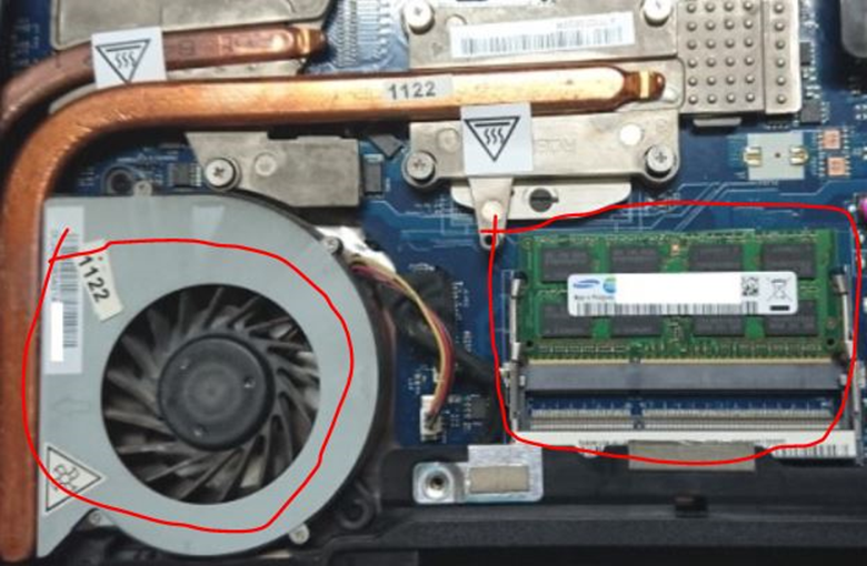 좌측이 노트북 쿨러인데 방열판으로 cpu와 GPU를 동시에 냉각시켜주고 있으며 우측에 노트북용 메모리 슬롯 2개중 한 개가 장착되어 있습니다.