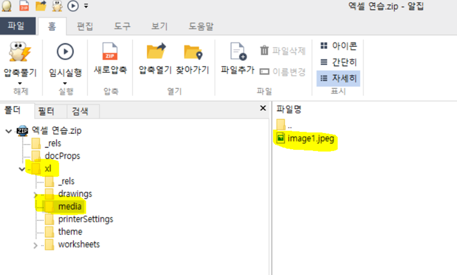 엑셀문서는 압축파일로 만든 후에 압축을 풀면 xl폴더 아래의 media폴더에 이미지가 들어가 있는것을 확인할 수 있습니다.